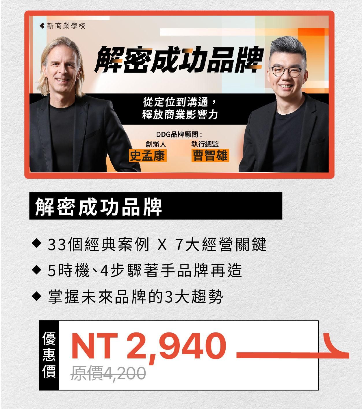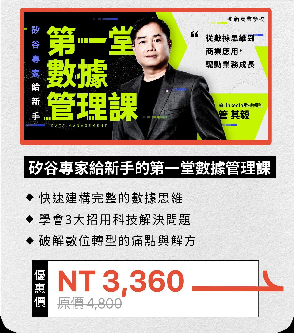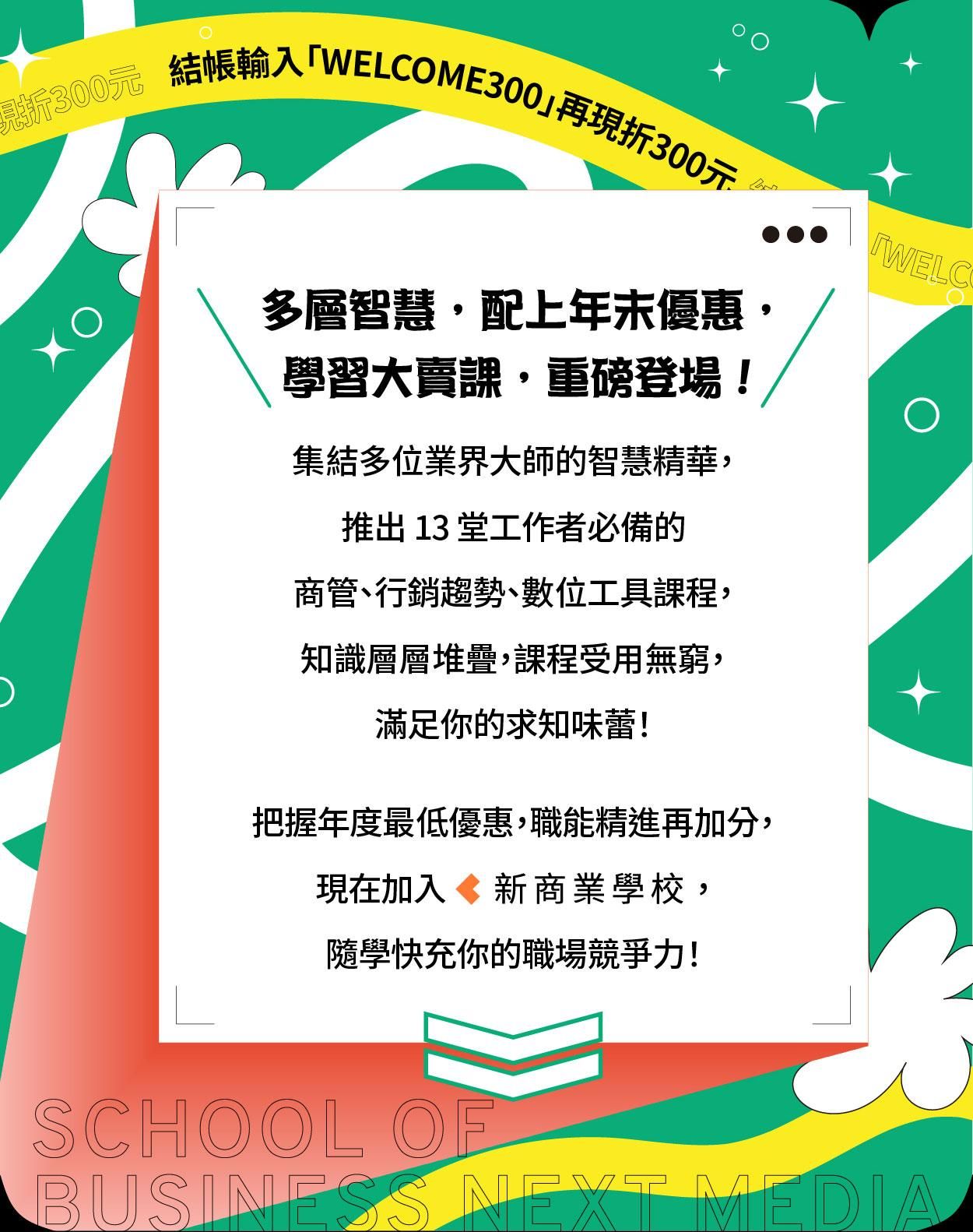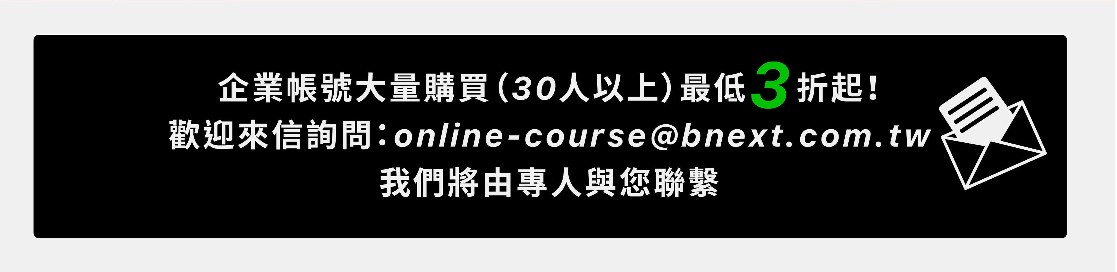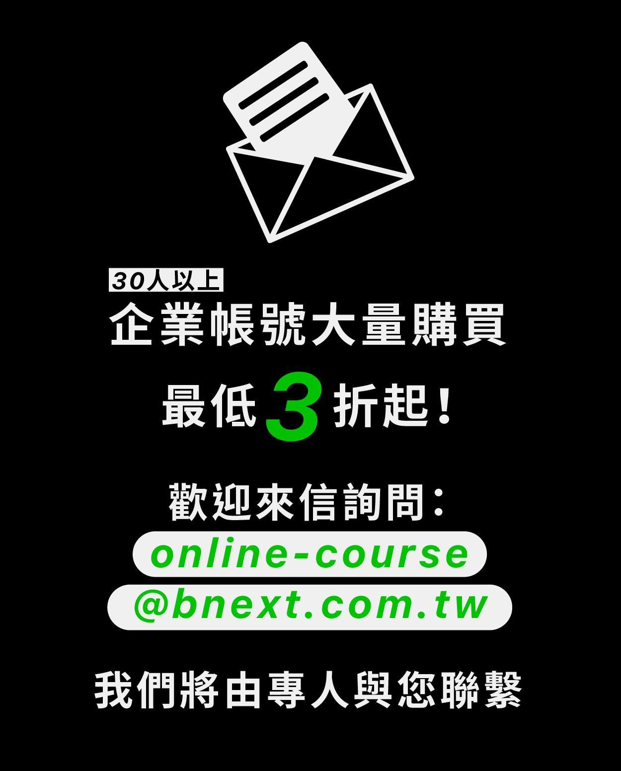 注意事項: ・ 活動期間為2023/11/8 (三) 至 2023/12/05(二) 23:59 止。 ・「雙11狂歡 7 折」方案於訂購付款完成後,即可開始課程。 ・加購《一次搞懂 ChatGPT 工作法》方案為特殊優惠不適用學習折扣金。 ・ 本活動新商業學校保留變更、修改、終止之權力,若有變更將依活動頁公告為準。 ・ 如有任何問題請來信新商業學校 online-course@bnext.com.tw