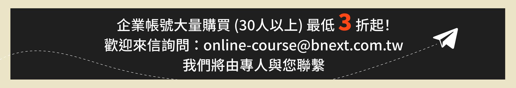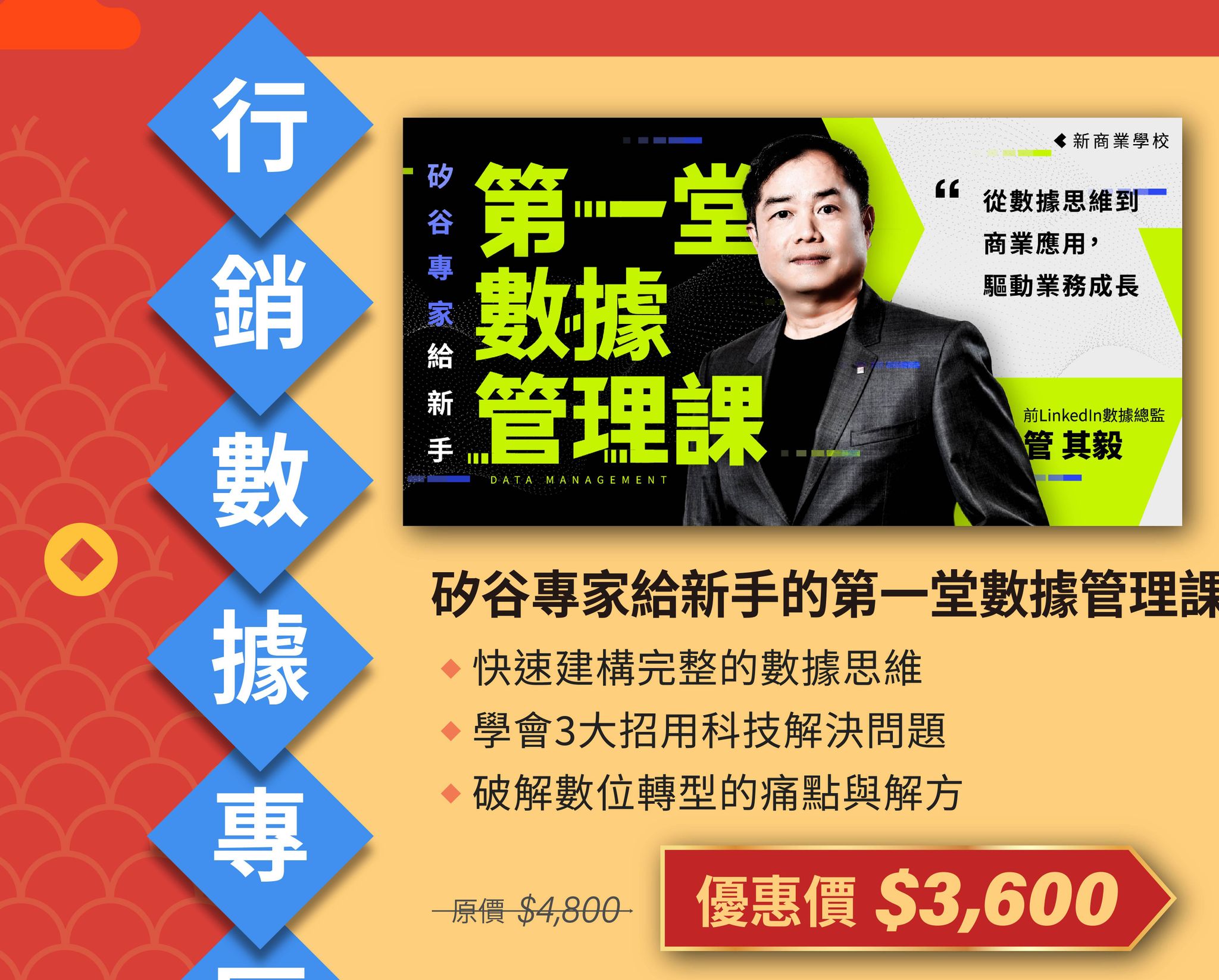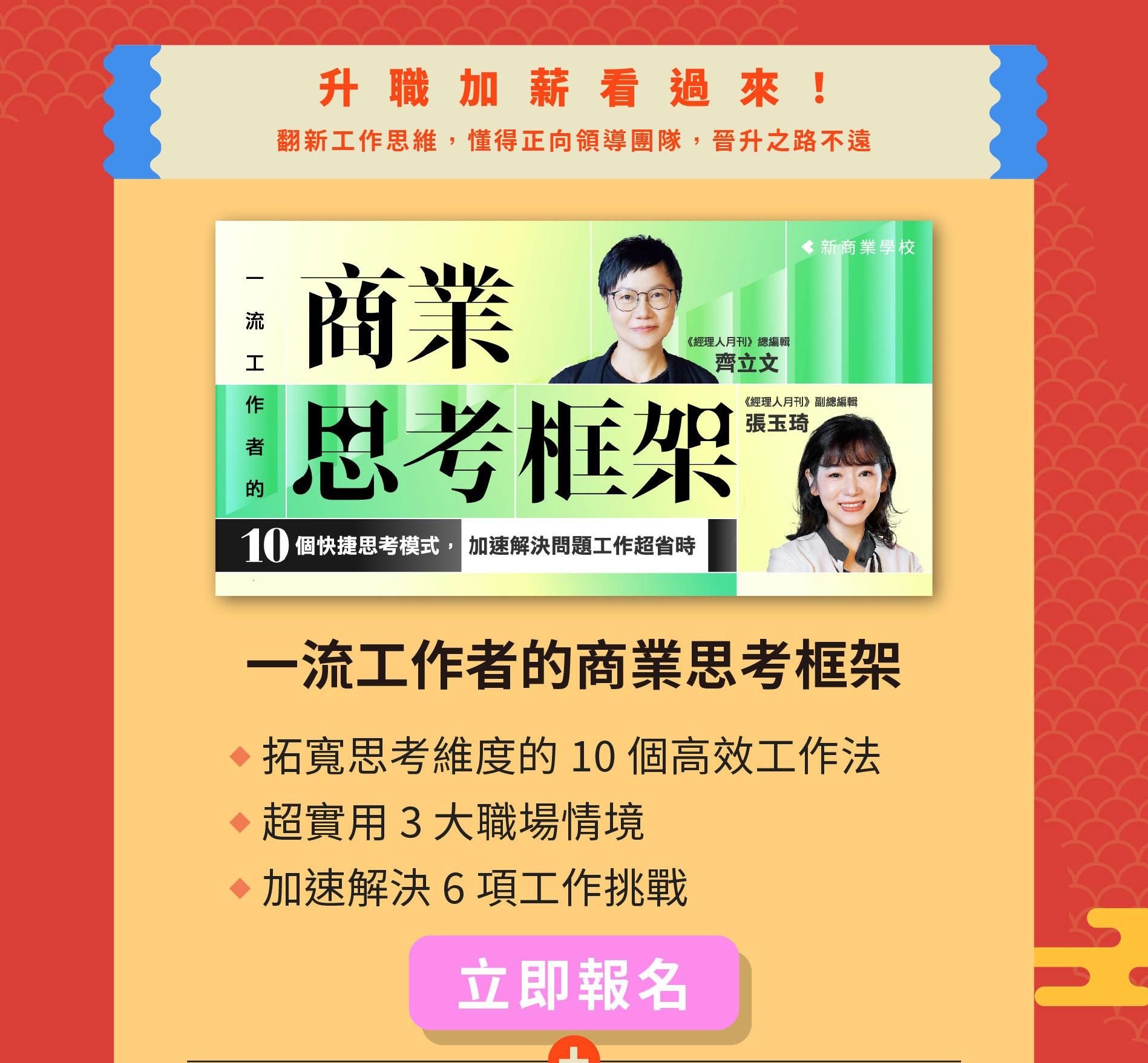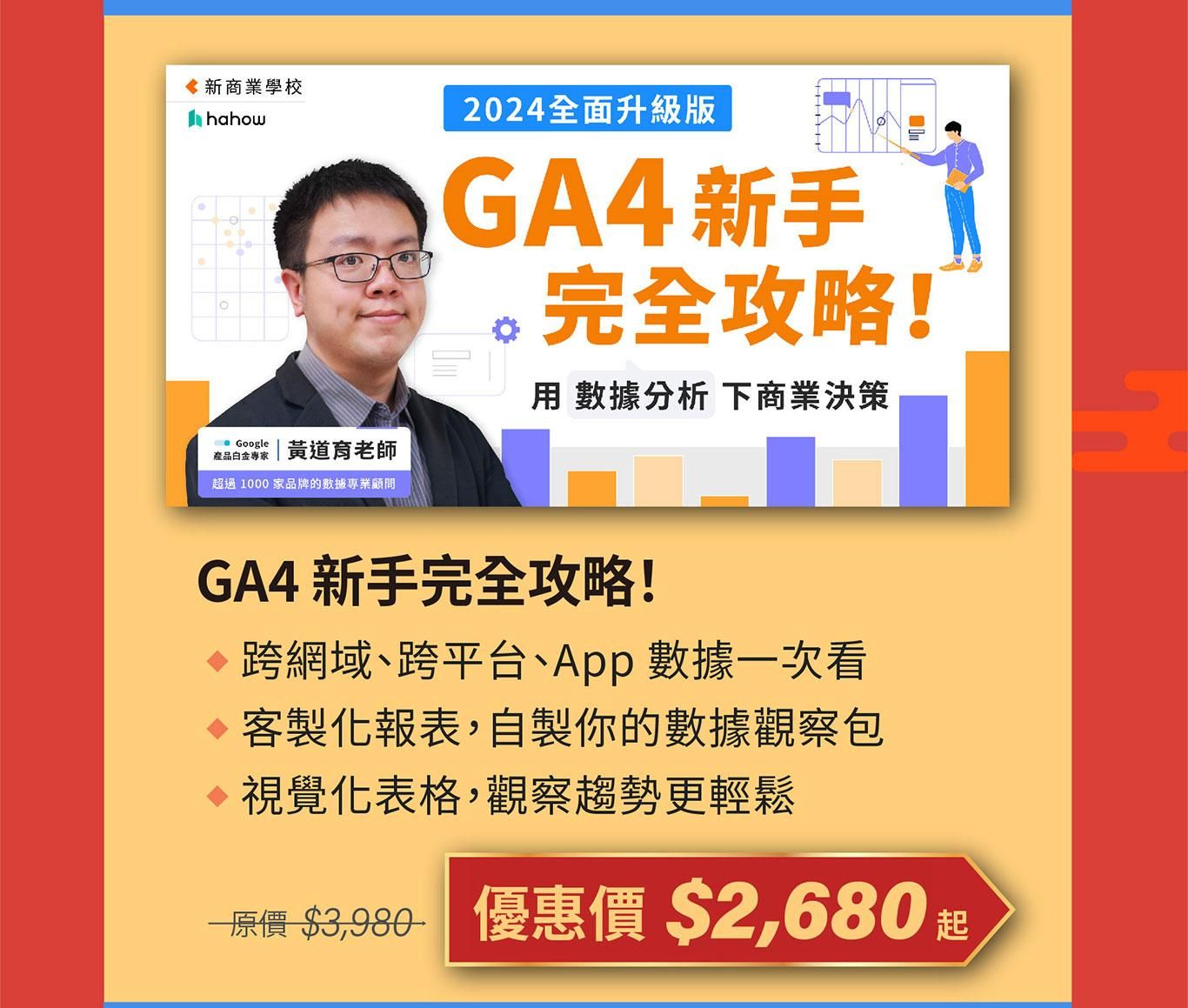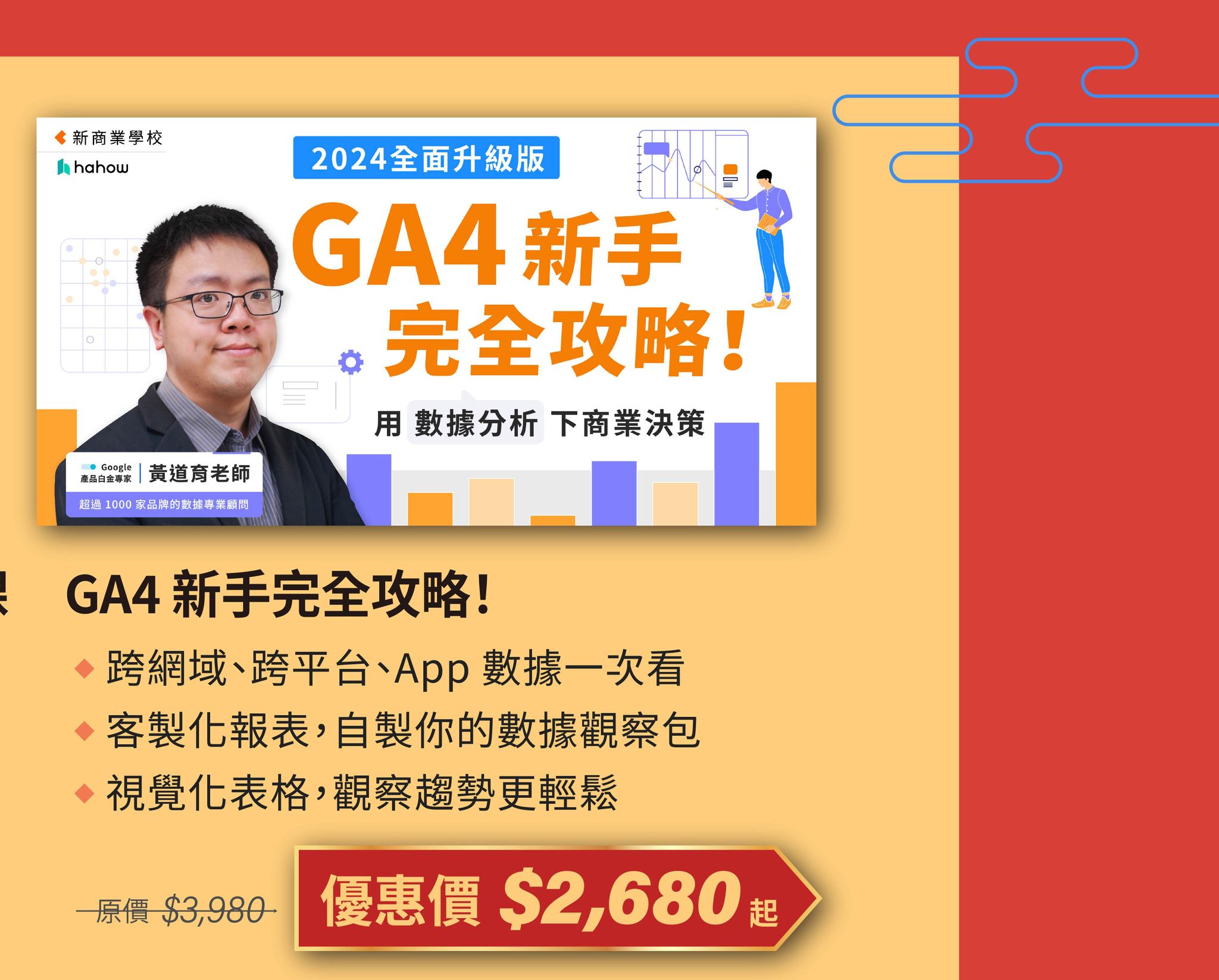 注意事項: ・ 活動期間為2024/1/22 (一) 至 2024/2/16 (五) 23:59 止。 ・ 新春案型於訂購付款完成後,除了《GA4 新手完全攻略!2024 全面升級版》將於3/26 (二) 正式開課,其他即可開始課程。 ・ 本活動新商業學校保留變更、修改、終止之權力,若有變更將依活動頁公告為準。 ・ 如有任何問題請來信新商業學校 online-course@bnext.com.tw