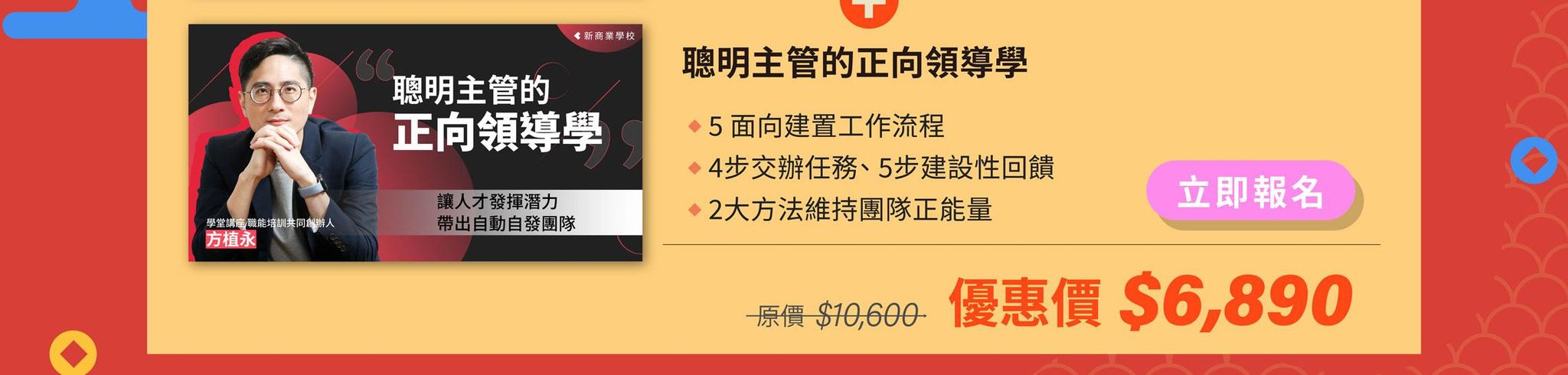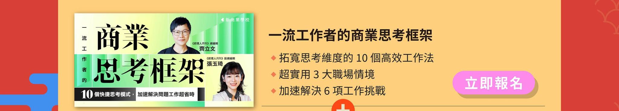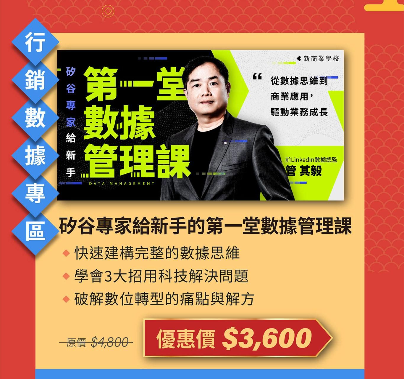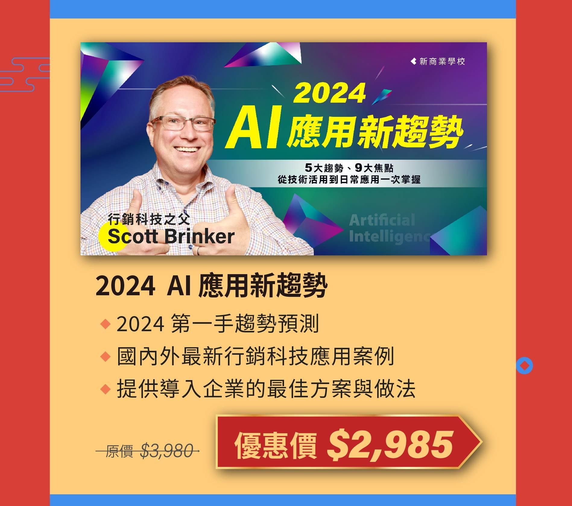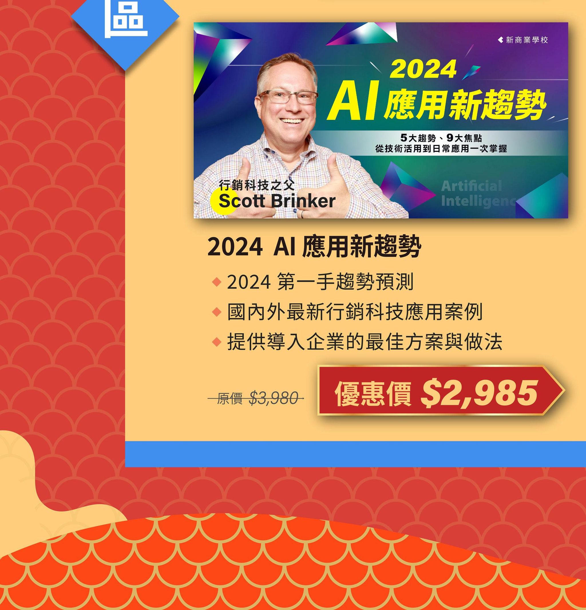 注意事項: ・ 活動期間為2024/1/22 (一) 至 2024/2/16 (五) 23:59 止。 ・ 新春案型於訂購付款完成後,除了《GA4 新手完全攻略!2024 全面升級版》將於3/26 (二) 正式開課,其他即可開始課程。 ・ 本活動新商業學校保留變更、修改、終止之權力,若有變更將依活動頁公告為準。 ・ 如有任何問題請來信新商業學校 online-course@bnext.com.tw