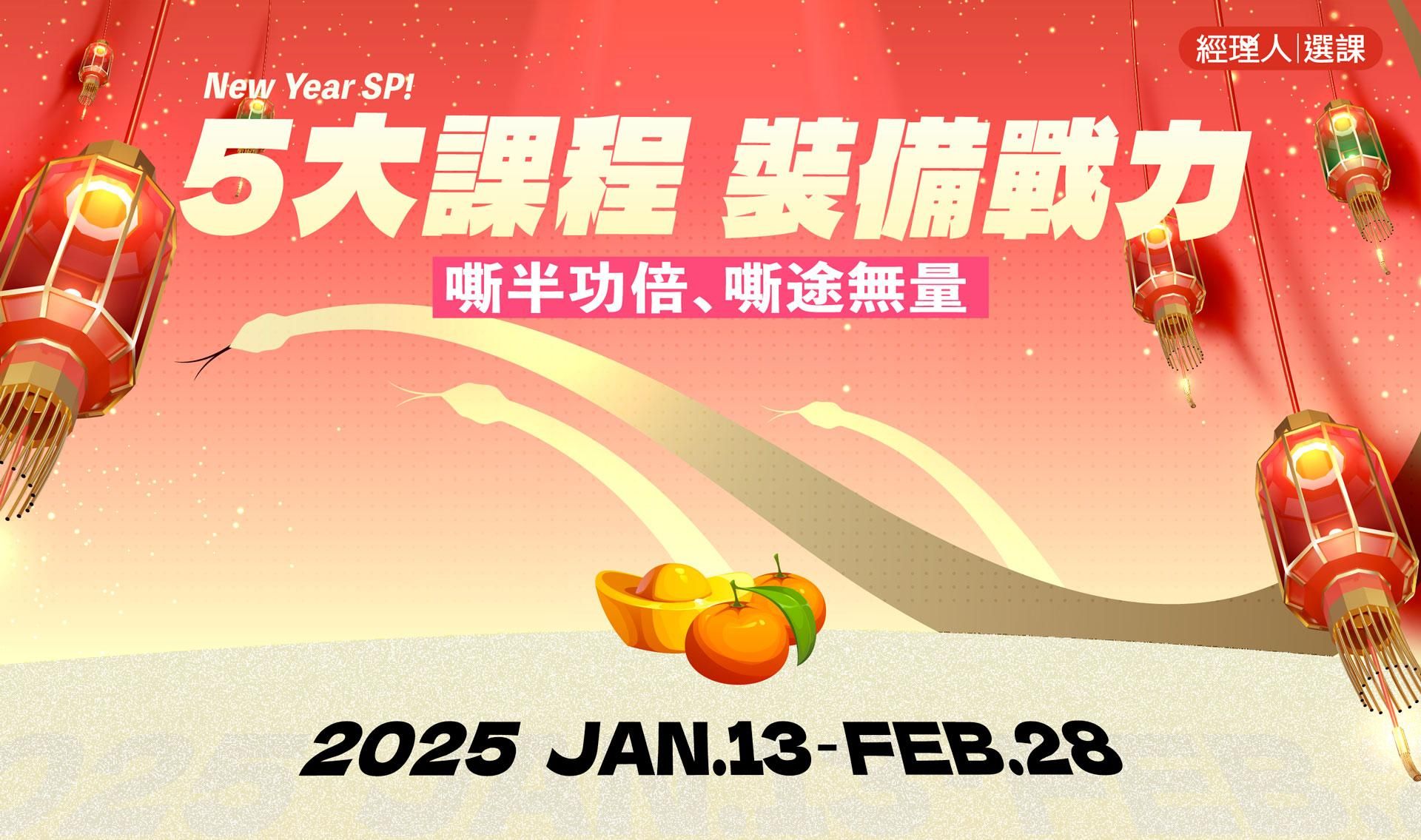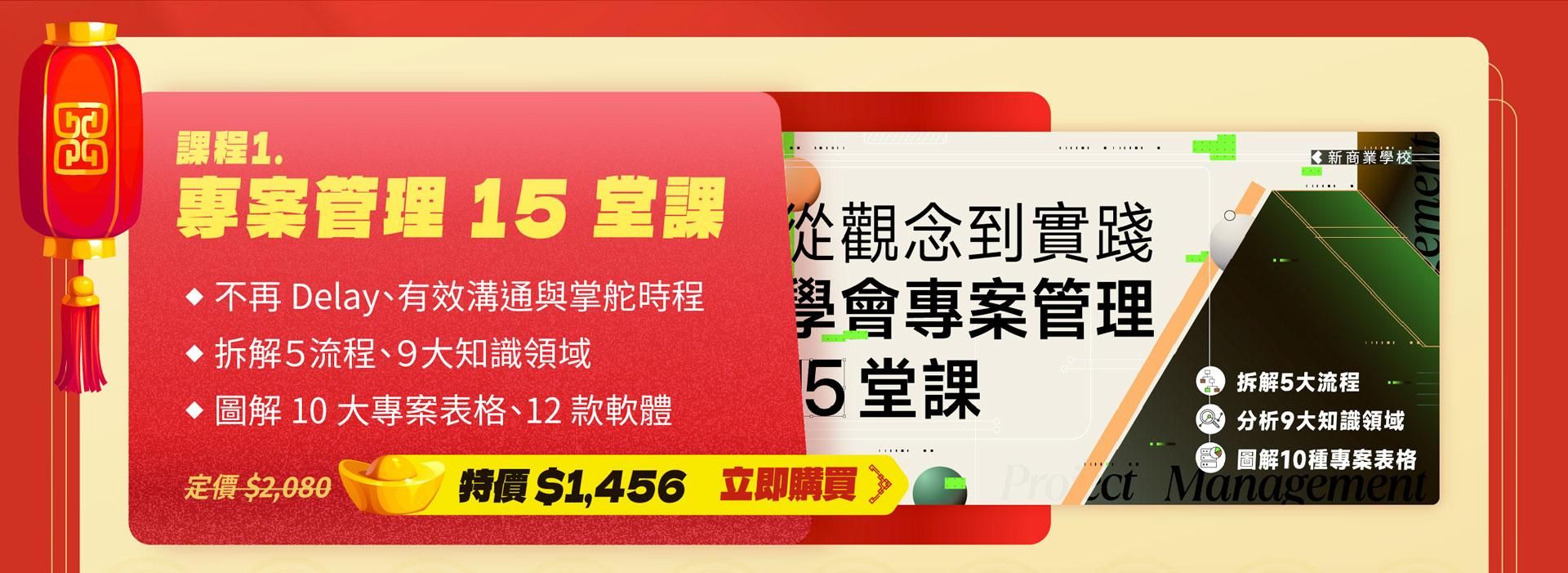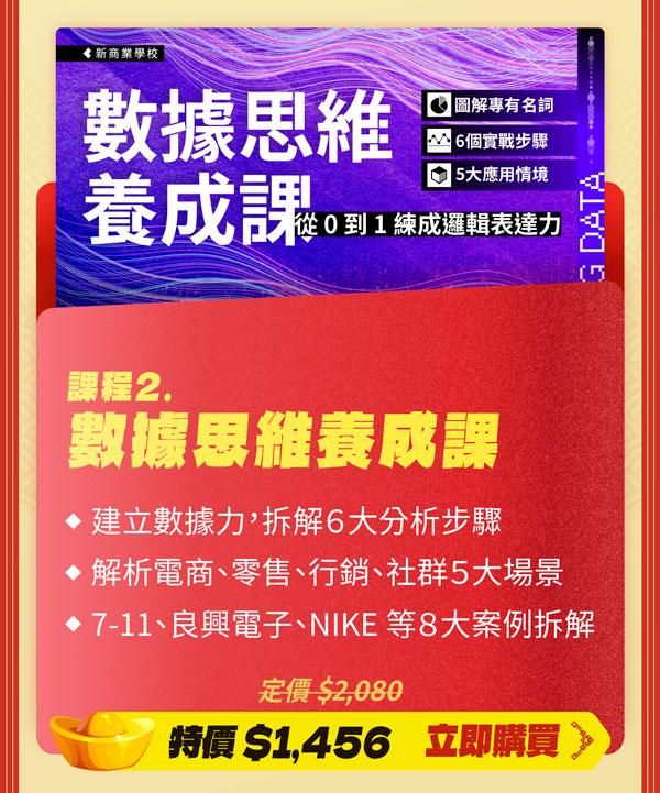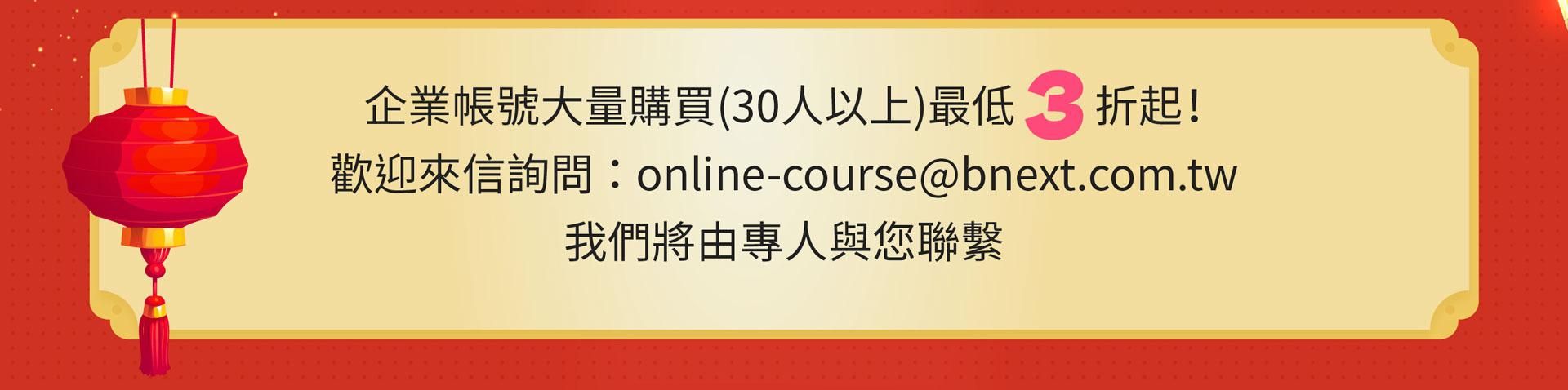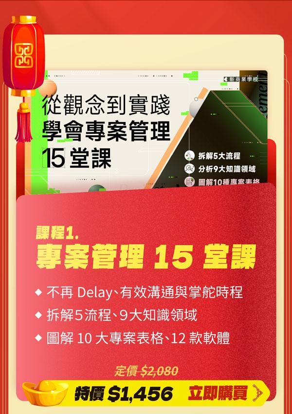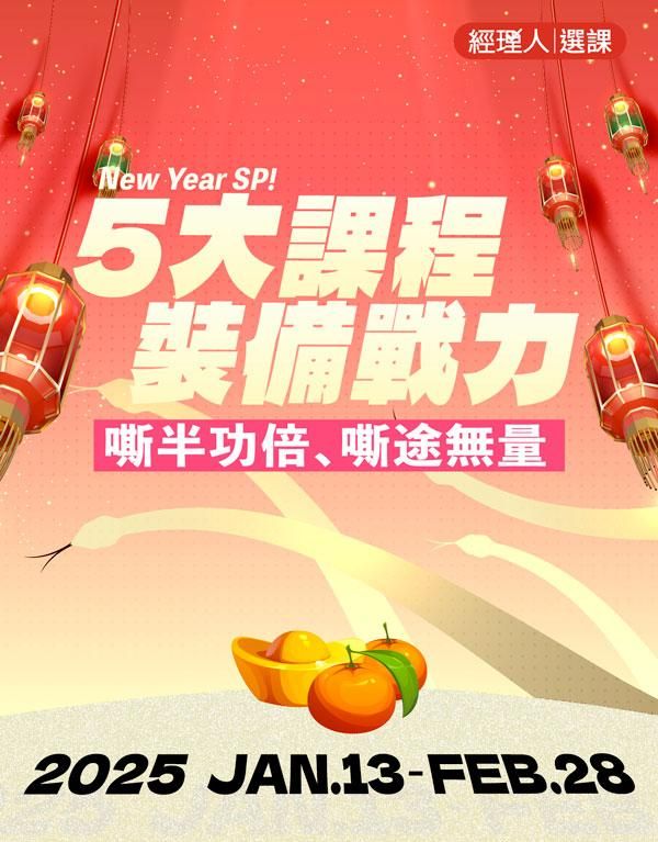 注意事項: ・ 活動期間為2024/1/13 (一) 至 2024/2/28 (五) 23:59 止。 ・ 新春案型於訂購付款完成後,即可開始課程。 ・ 本活動新商業學校保留變更、修改、終止之權力,若有變更將依活動頁公告為準。 ・ 如有任何問題請來信新商業學校 online-course@bnext.com.tw