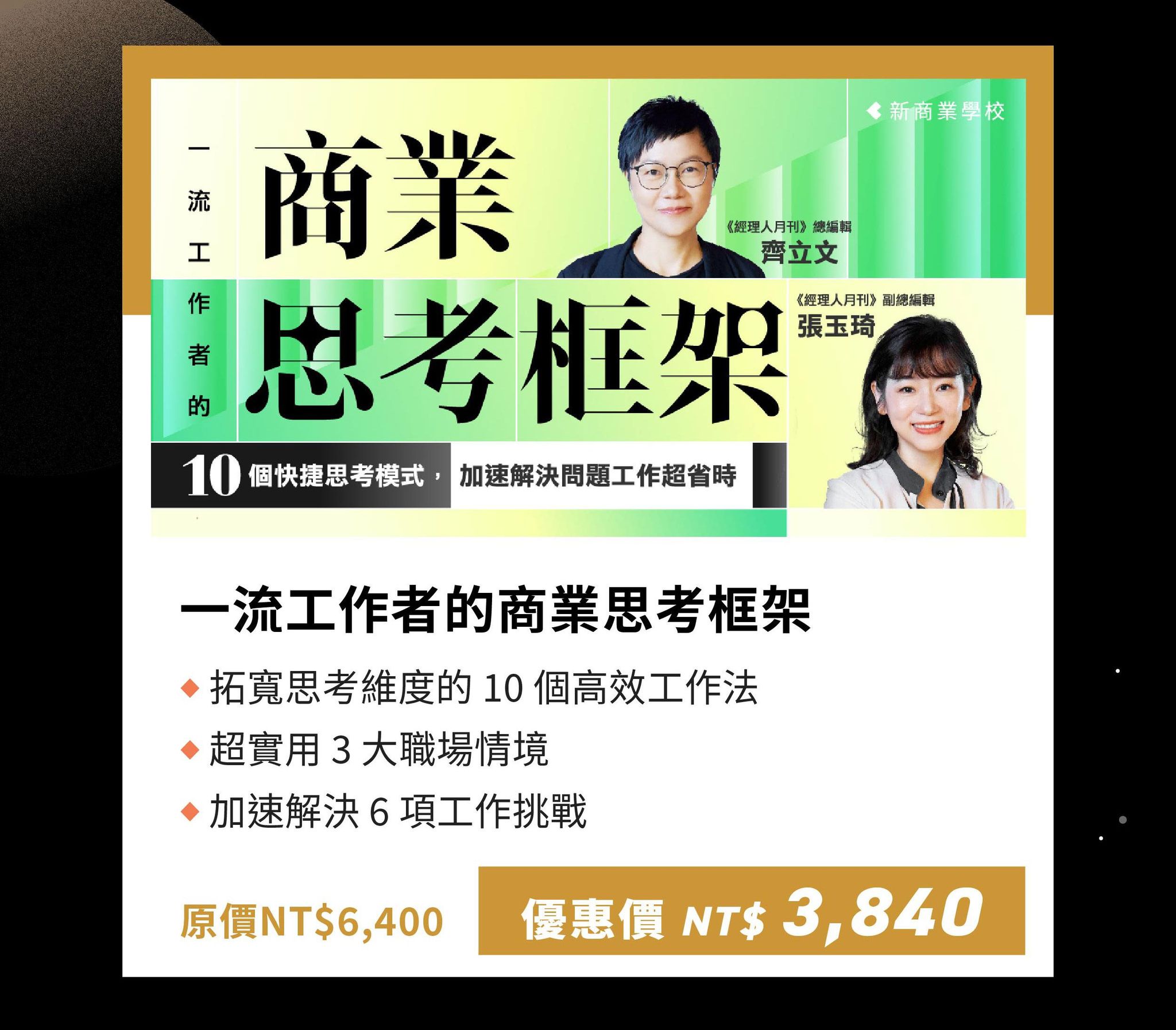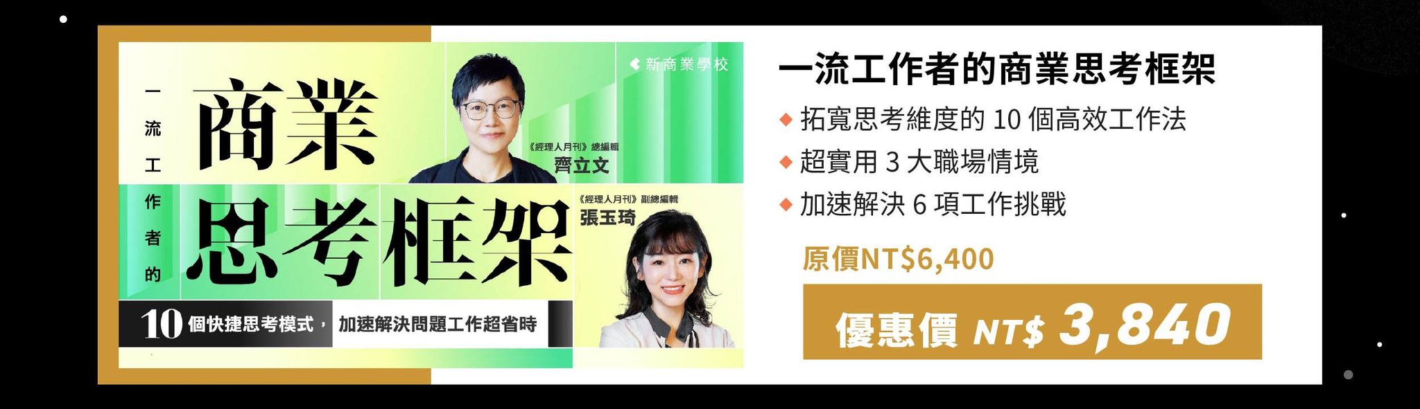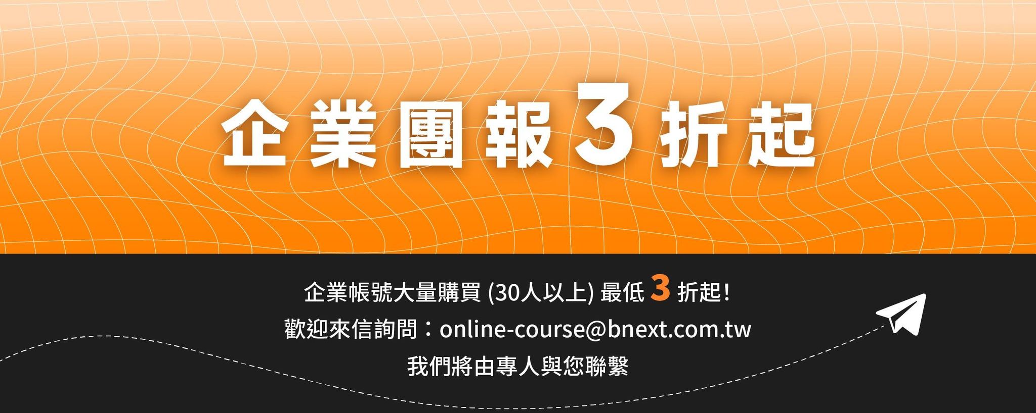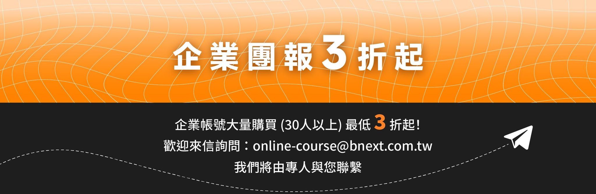 注意事項: ・ 活動案型於訂購付款完成後,即可開始課程。 ・ 本活動新商業學校保留變更、修改、終止之權力,若有變更將依活動頁公告為準。 ・ 如有任何問題請來信新商業學校 online-course@bnext.com.tw