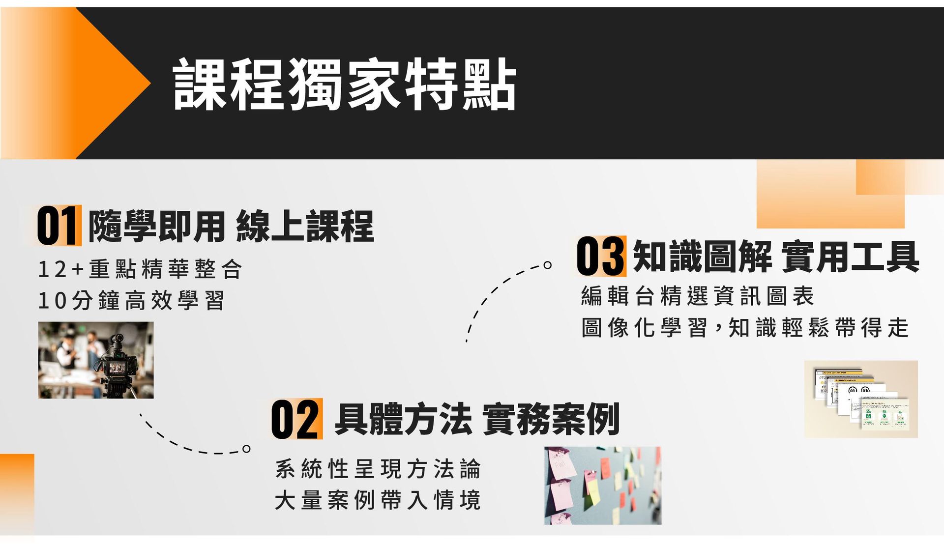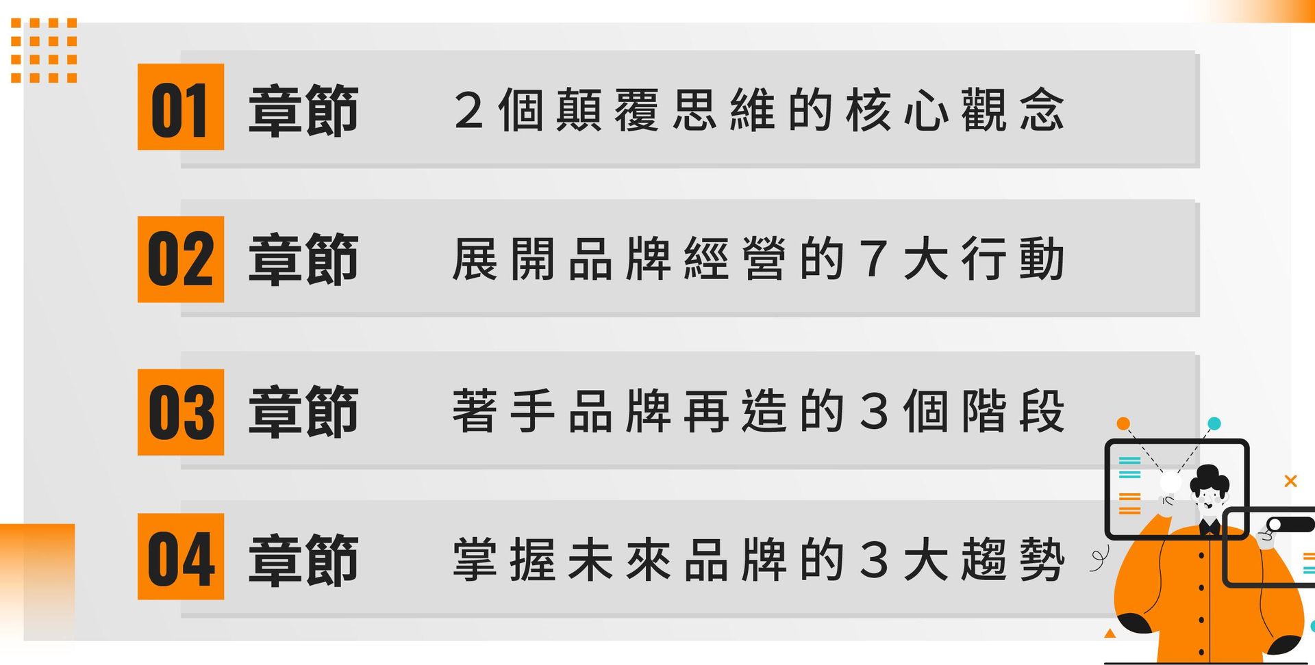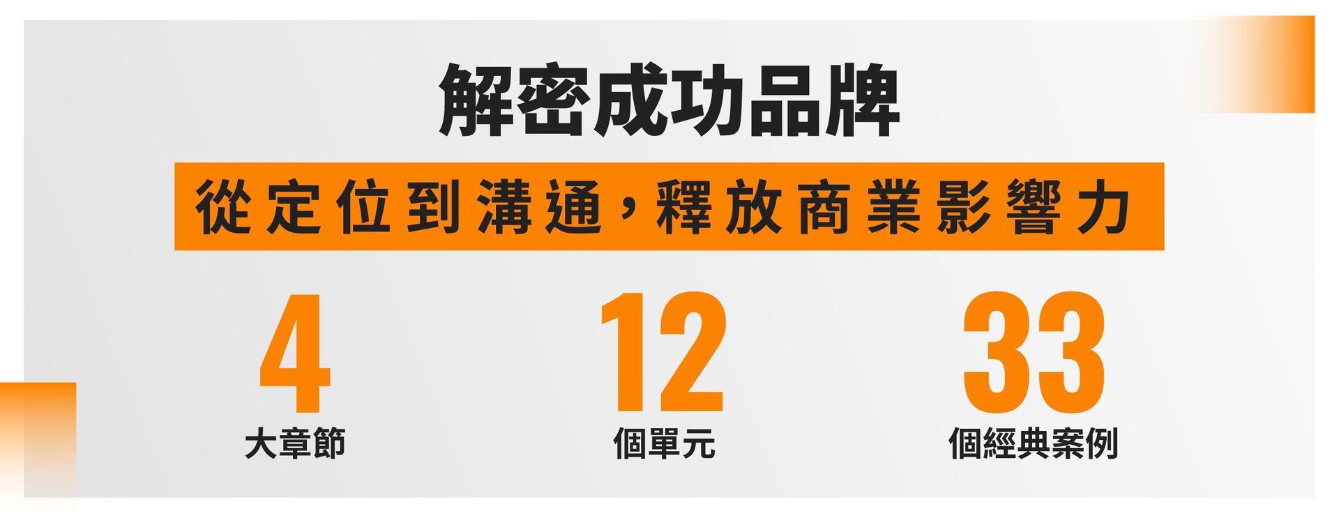 課程分成四大章節,十二單元,集結了三十三個經典品牌案例,包括:Netflix、Tesla、Patagonia、IBM、可口可樂、AESOP、NIKE、Gogoro、星巴克、Uniqlo……等。