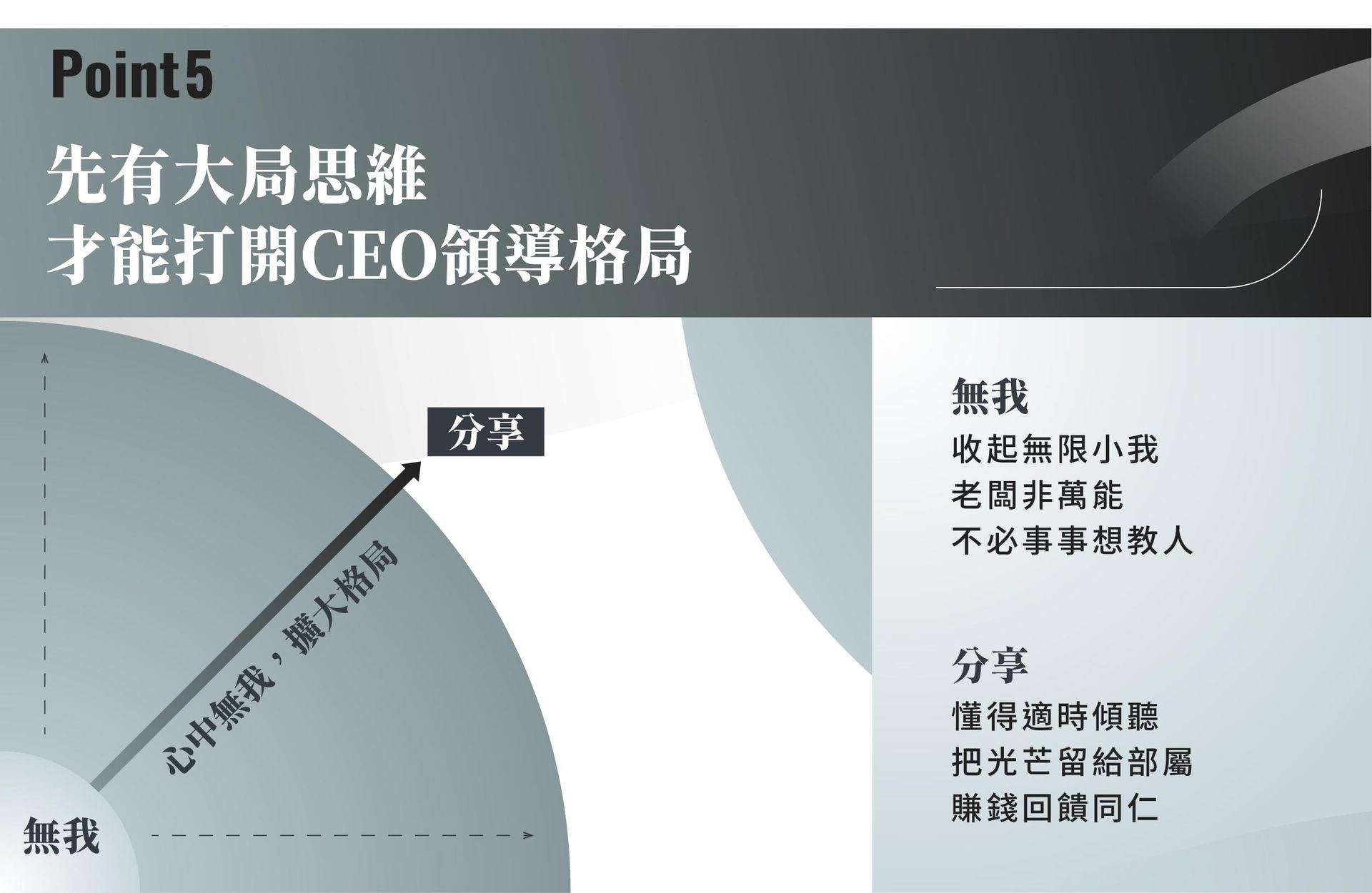 何飛鵬認為成就一位頂尖CEO,在於「格局」有多大,首先要有「大局思維」,一個人的格局在於願意容納多少他人,其中「無我」與「分享」就是關鍵,人愈往高位走,愈要傾聽,並懂得把光芒留給部屬,才是擁有大格局的領導者。
