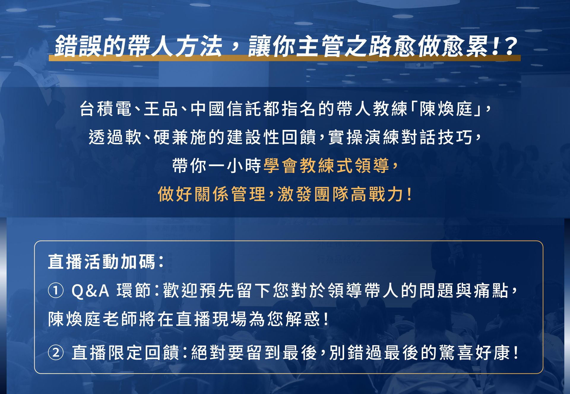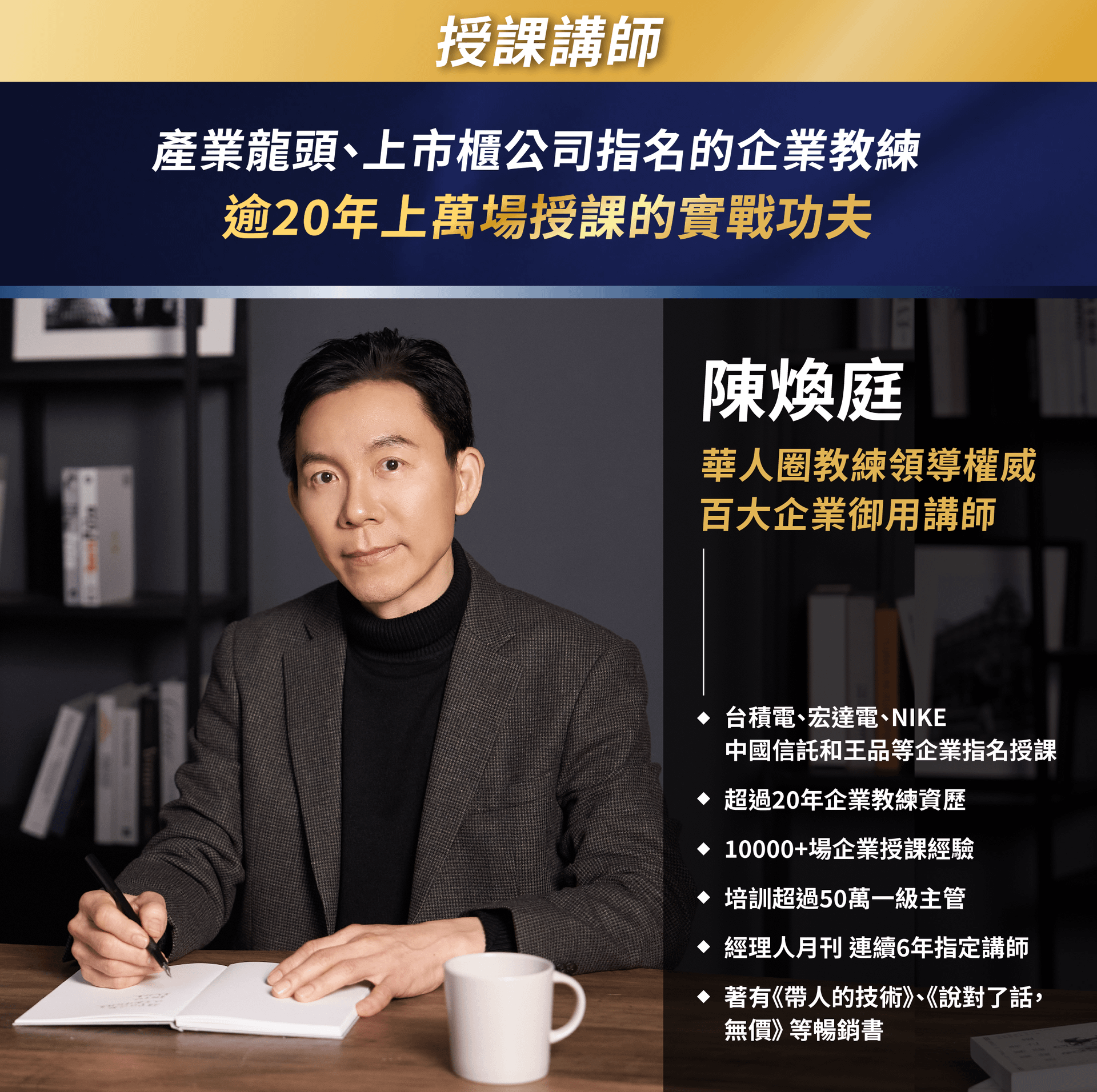 > 台積電、宏達電、星巴克、中國信託和王品等企業指名授課 > 超過20年企業教練資歷 > 10000+場企業授課經驗 > 培訓超過50萬一級主管 > 經理人月刊 連續6年指定講師 > 著有《帶人的技術》、《說對了話,無價》等暢銷書